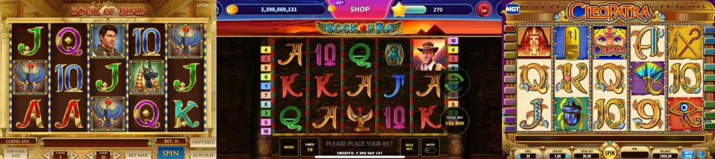 - Book of Ra — един от най-известните египетски слотове от Novomatic, който въвежда символа “Книга”, отварящ достъп до безплатни завъртания и бонусни рундове.