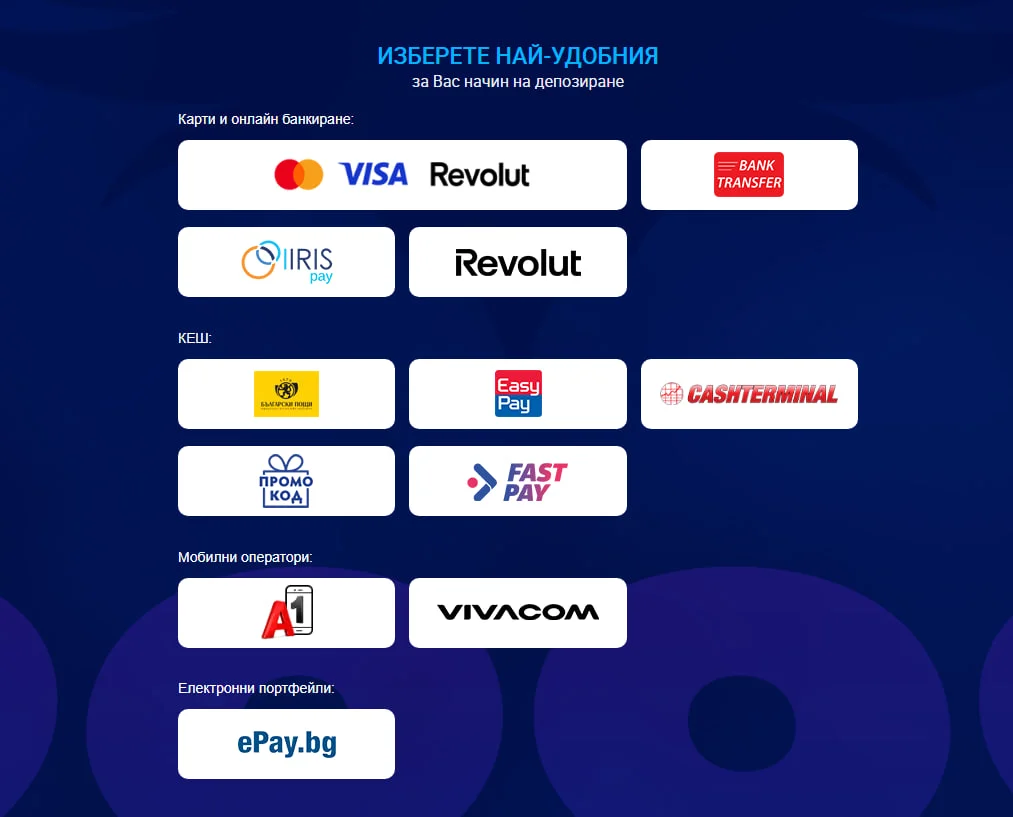 | EasyPay | 10 BGN | 4999 BGN | Мигновено | Плащане на каса EasyPay |